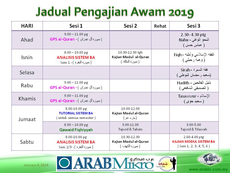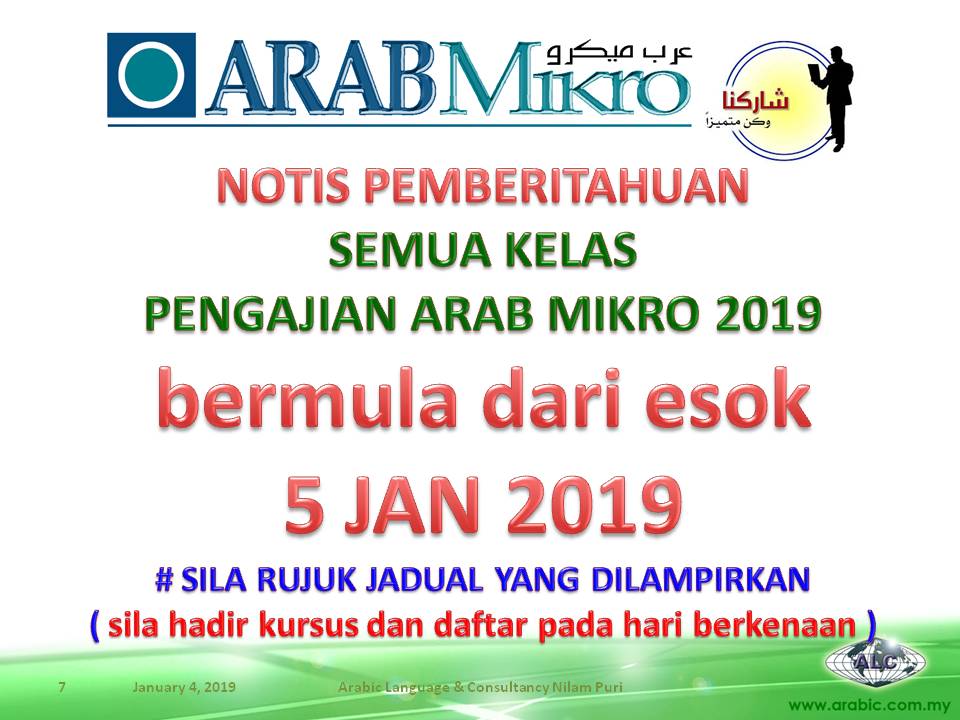 1. Adalah dimaklumkan kelas Pengajian Arab Mikro 2019 akan bermula esok 5 Januari 2019. Dato/Datin/Tuan/Puan dijemput mendaftar dan memulakan pengajian seperti biasa dari hari esok.